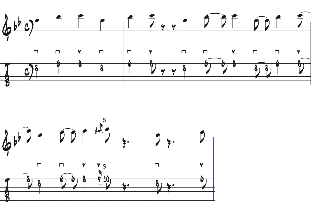 ソニー・ロリンズやデクスター・ゴードンがよくやる手法で、時間と戯れるような独特のアプローチで、同じフレーズをわざとズラして吹いたりする感じ。あれがまた、すごく魅力的なんだ。ちょっと弾いてみよう。