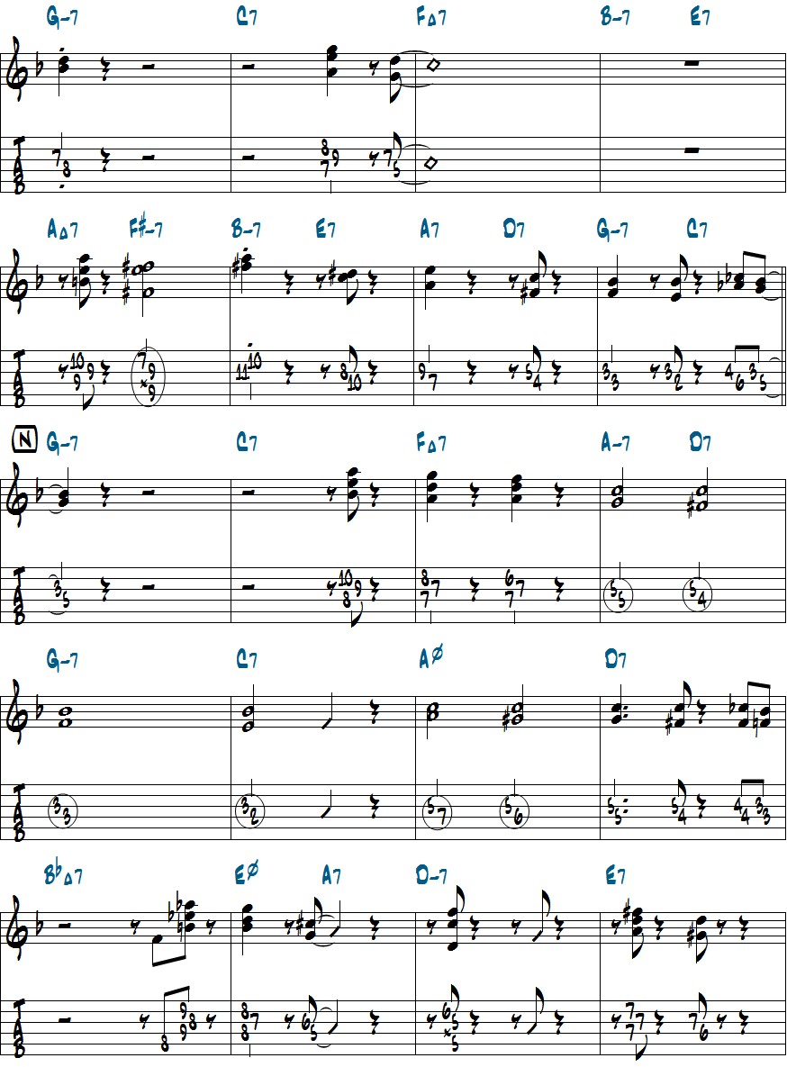 ジムホールはAm7を想定してアドリブと後のコンピングをしていますが、ピアニストはA7を想定しています。