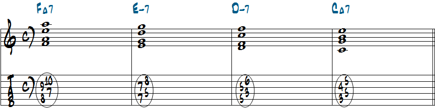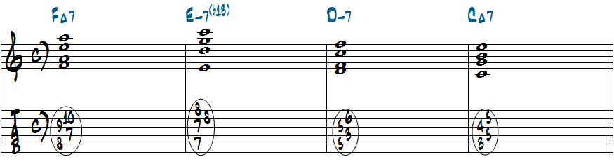ここではFMa7-Em7-Dm7-CMa7を例に各テンションのサウンドを聴いてみましょう。