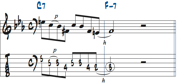 Cm7の2、3小節目は8分を使ったリズムモチーフです。